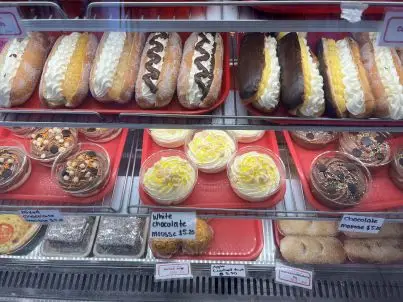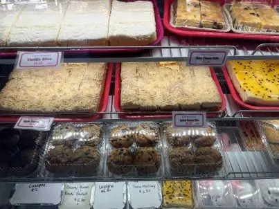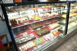 New Land Bakery has an extensive range of cakes, pastry and sweets plus a wide selection of cold drinks from the refrigerator.