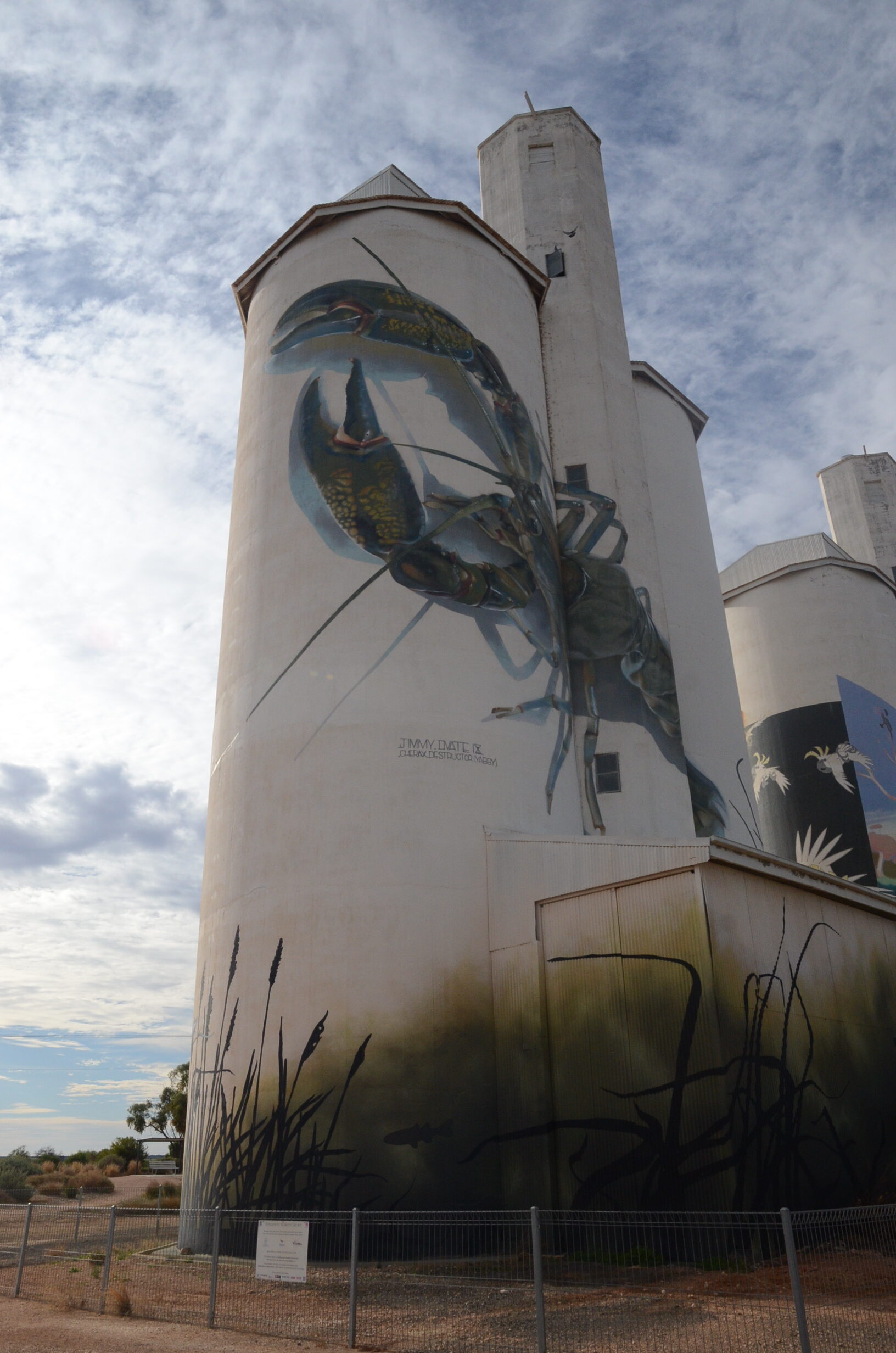 Featuring on Jimmy’s silo is local native flora and fauna, including a giant Yabby and the endangered Regent Parrot. Jimmy has also included other endangered species such as the Murray Hardyhead and the Spiny Daisy.