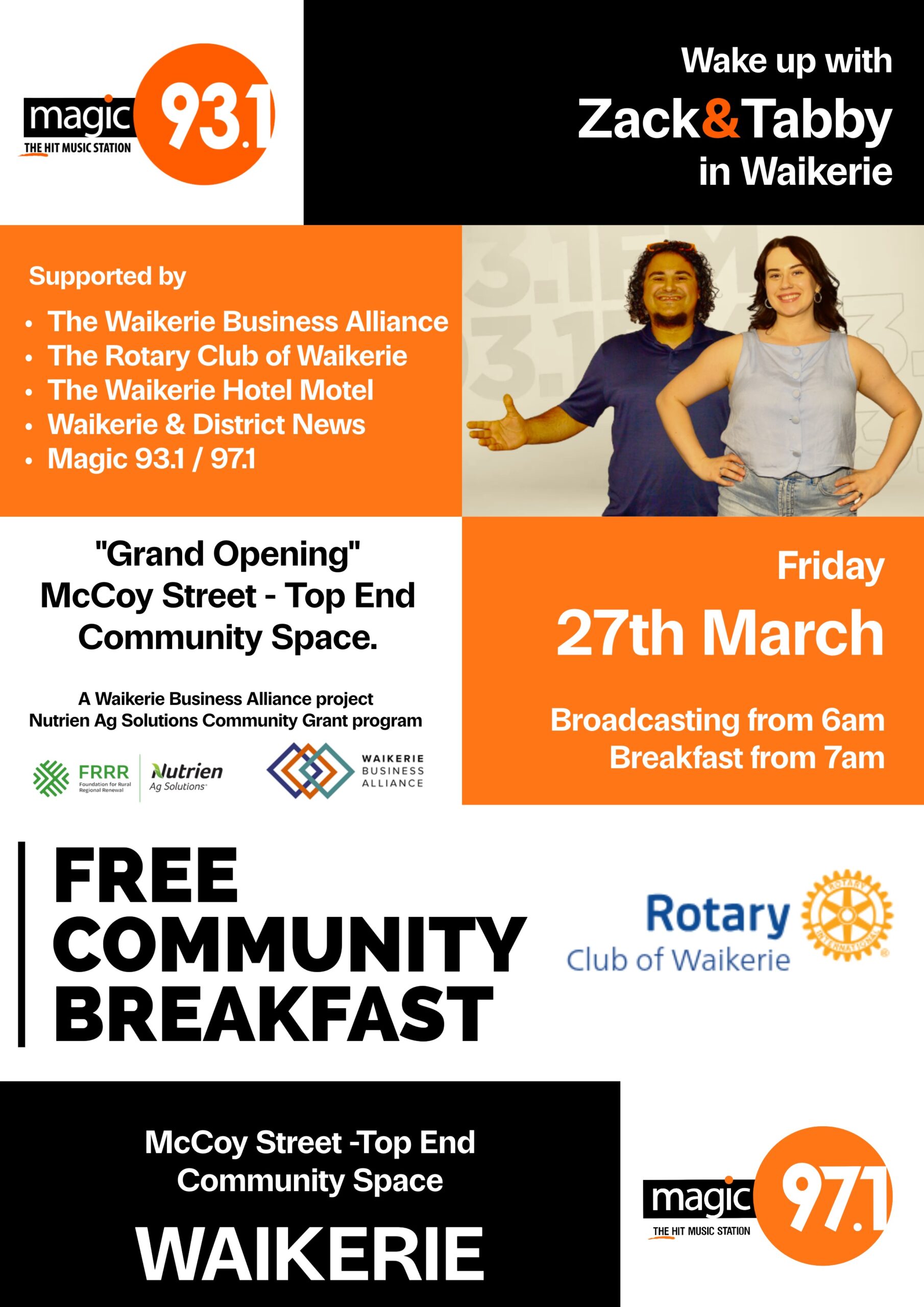 Wake up with Zack and Tabby from Magic FM 93.1 in Waikerie on Friday 27th March for the Grand Opening of the McCoy Street – Top End Community Space.